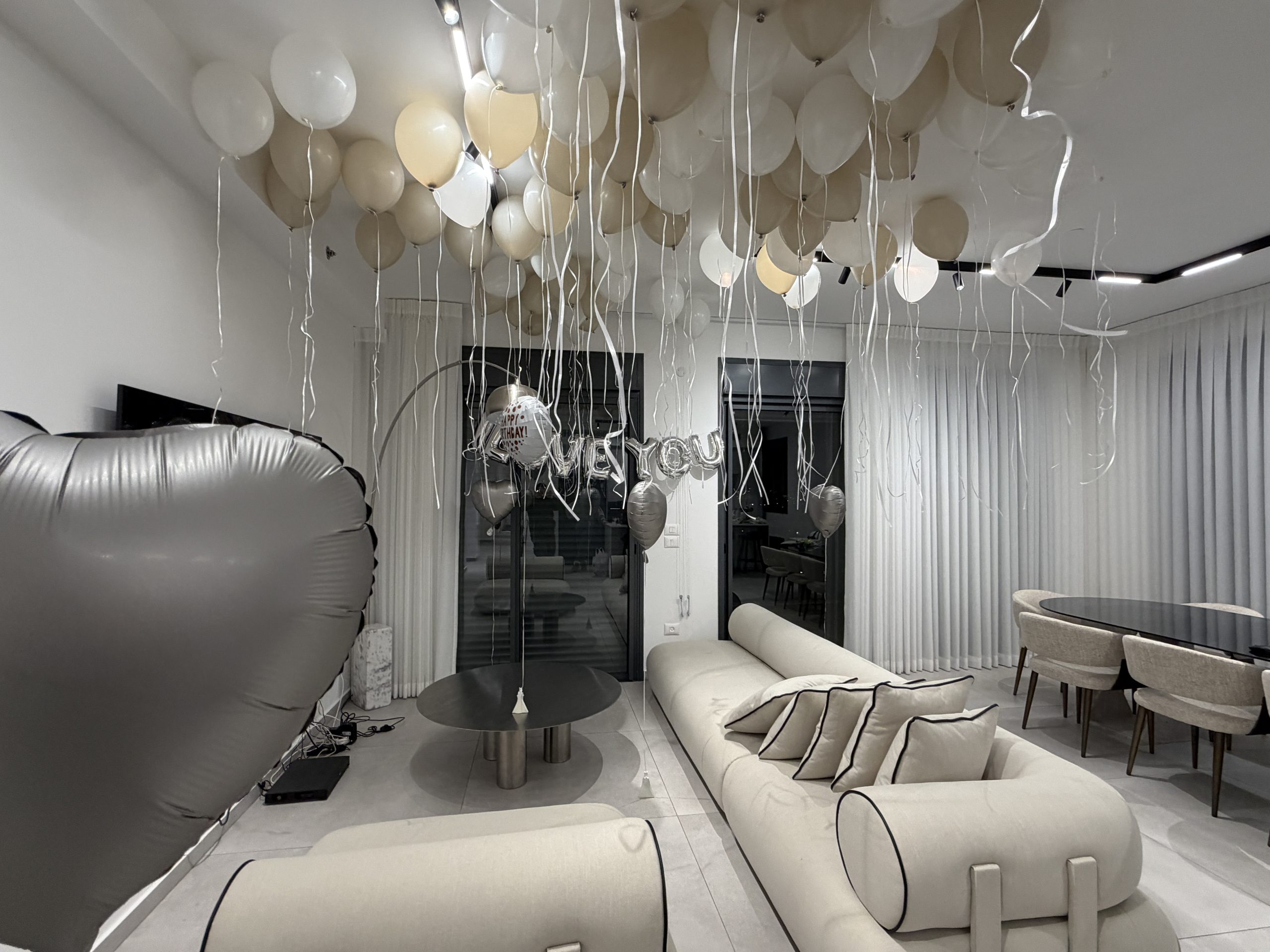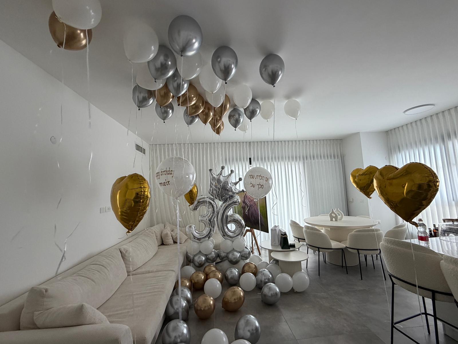 • בלוני רצפה בקומפוזיציה אורגנית: פיזור מאוזן ומחושב של בלונים בגדלים שונים (ממיניאטוריים ועד ענקיים) על רצפת החדר, ליצירת תחושת שפע ונפח מבלי לחסום את המעברים.
