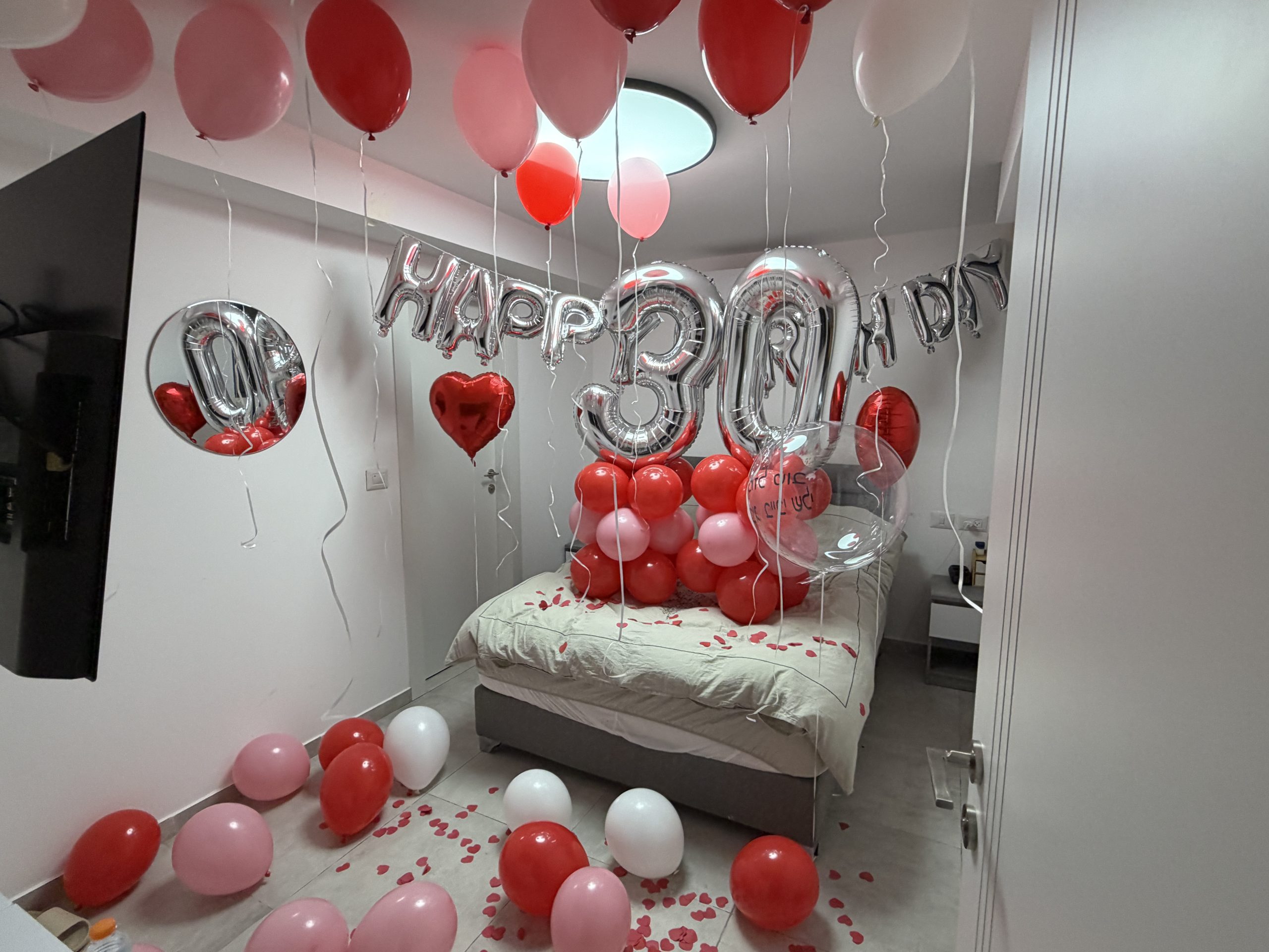 • מוקדי עניין חזותיים (Focal Points): בניית אלמנטים מרכזיים שמושכים את העין מיד עם פתיחת הדלת. זה יכול לכלול בלוני ספרות ענקיים לציון גיל, סטנדים מעוצבים ומורכבים בצידי המיטה, או שילוב של אותיות מוארות (כגון MARRY ME).